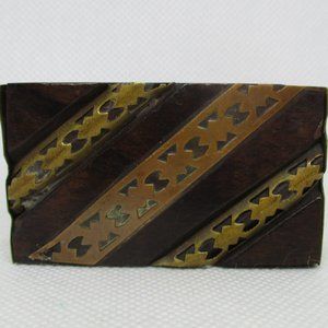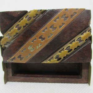 Vintage Brass & Wood rectangular-shaped trinket box. The top is carved wood with cut-out brass inlays, the ends are brass over wood, a small jewelry box, and a pillbox. Collectible item and for use. Brsss needs polishing or it is nice just the way I am selling it.