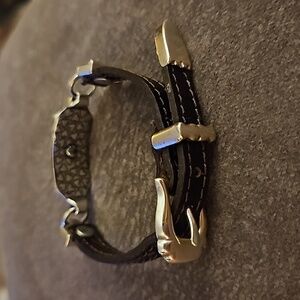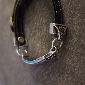 Introducing the VTG Brighton 1990s Floral Black Leather Band Bracelet, a fusion of vintage charm and contemporary style. Crafted with supple black leather and adorned with intricate floral accents, this bracelet captures the essence of timeless beauty. Its versatile design allows it to transition seamlessly from day to night, adding a touch of sophistication to any outfit. Whether worn solo as a statement piece or stacked with other bracelets for a bohemian-inspired look, this bracelet is sure to make a lasting impression. Embrace nostalgia with a modern twist and let your unique style bloom with the allure of yesteryear.
