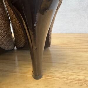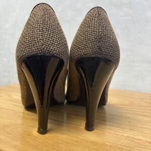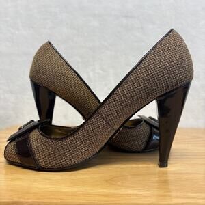 VTG Bakers Jenni Brown Patent Leather Tweed Gold Buckle Peep Toe Pumps Size 8