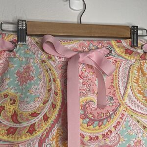 The product is a vintage Bamboo Traders paisley skirt in a boho floral stretch design, perfect for a spring garden party. Made from a combination of cotton and spandex, the skirt features a colorful pastel palette and a size 10P for petites. With a true vintage appeal from the 1990s era, this arts and crafts look skirt is ideal for those who appreciate unique and eclectic fashion pieces for special occasions like parties.