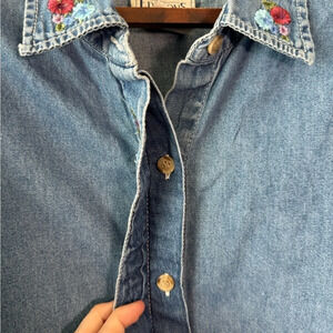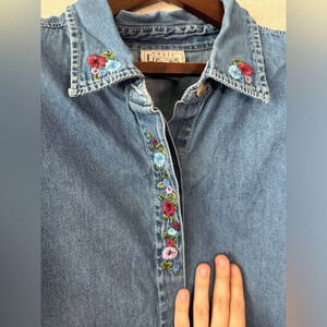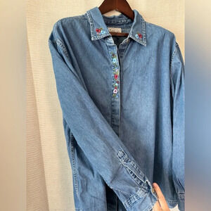 Vintage Basics Edition Plus Denim Floral Embroidered Button Up, features floral embroidery on the collar and down the front button flap. In great condition.