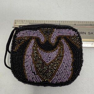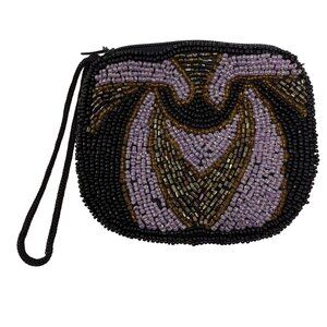This beaded clutch/wristlet/coin purse offers a compact yet stylish accessory with a secure zip closure and wrist strap. Its intricate purple and gold abstract design adds sophistication.