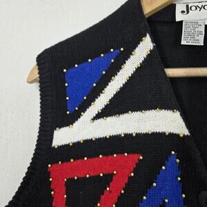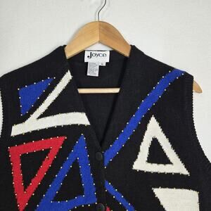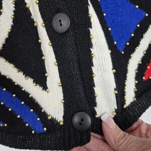 VTG Beaded Sweater Vest Sz M Black Red Blue White Geometric Button Front Retro