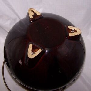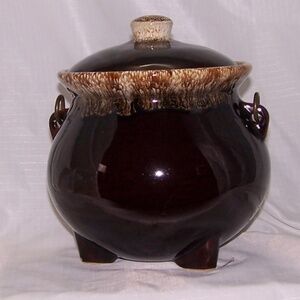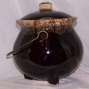 This is a vintage Hull Pottery brown drip glaze bean pot, crafted in the United States, likely between the 1950s and 1960s. It features a round shape, a brown drip glaze finish, and a lid with a handle. The pot also has a bail handle and three small feet. It is oven-safe and can be used for cooking or as a decorative item. The pot is a two-piece set with the lid and pot.