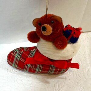 VTG Bear Present Holly in Plaid Stocking Christmas Tree Ornament Plush 3"x4"