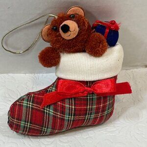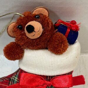 Cute Vintage Soft Brown Bear in Stuffed Soft Plaid Stocking Christmas Tree Ornament