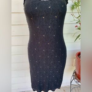 Retro Betsey johnson New York sexy shift slip dress black with glitter swirl Abstract beaded design at top very stretchy adjustable straps.