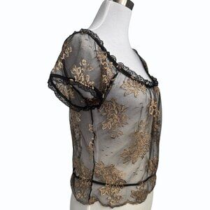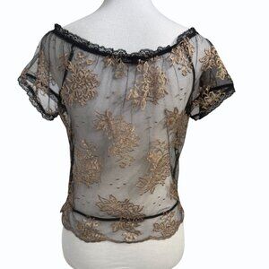 VTG Betsey Johnson NY Lace Skirt Top Set Size 8 Black Gold Sheer Pinup Retro