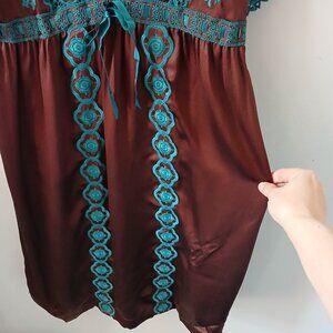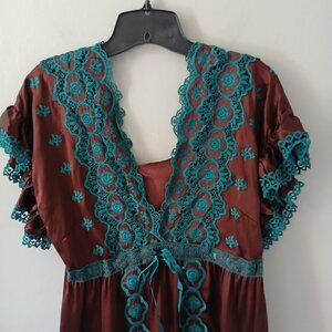 VTG Betsey Johnson Size 8 Women's 100% Silk Dress Brown Blue Crochet Midi Lined