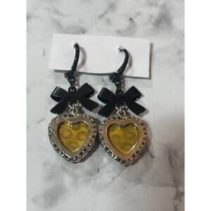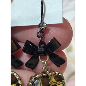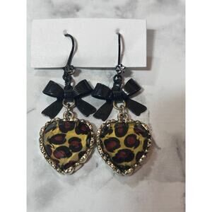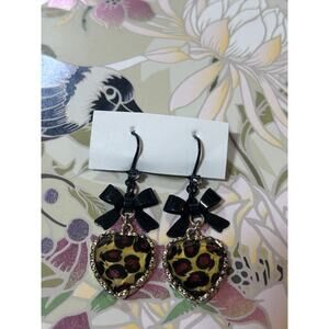 Vintage Betsey Johnson Y2K Leopard Heart Drop Bow Dangling Earrings Chic Coquette Goth Witchy Fairy Grunge.