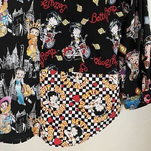 So fun! Betty Boop themed! Fabric is cotton, the different themes are patched together to create a sort of collage. Stitching is quality, shoulders double stitched. Fits loose, relaxed estimation is M/ L. Unbranded, not sure if this is handmade. The piece is quality, no flaws!