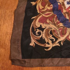 The VTG Bill Blass Silk Scarf is a stylish and regal accessory perfect for special occasions. Made from 100% silk in a classic black color with brown bordering, this scarf features a coat of arms design that exudes a Victorian look. Measuring 31 x 30 inches, this original vintage piece by designer Bill Blass is a timeless addition to any woman's wardrobe, adding a touch of elegance and sophistication to any outfit. Perfect for those who appreciate vintage accessories with a unique and classic style.