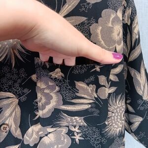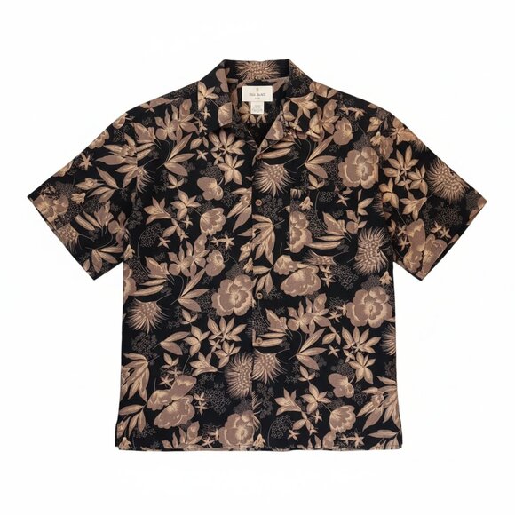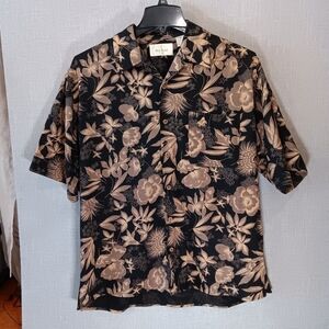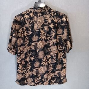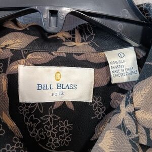 Add a stylish touch to your outfit with this Hawaiian 100% silk shirt from Bill Blass. The black and beige color scheme give it a put together yet relaxed look that is perfect for travel, casual outings, or workwear. It is size large and has one pocket. It is also washable which is a nice feature for silk. This designer top would make a great addition to any wardrobe. Thanks for looking!