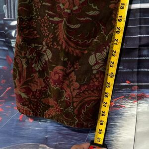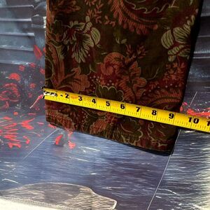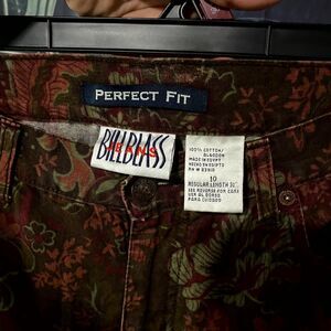 Make a unique fashion statement with these striking VTG Bill Blass straight jeans, a distinctive piece that effortlessly marries vintage luxury with a modern edge. Sized Women's 10, these trousers stand out with their rich brown denim base, which is completely covered in a complex, multi-toned paisley and floral print. This pattern incorporates deep reds, olive greens, and subtle gold tones, giving the jeans a luxurious, almost tapestry-like finish.