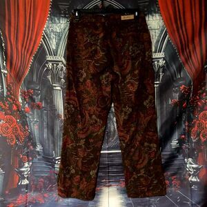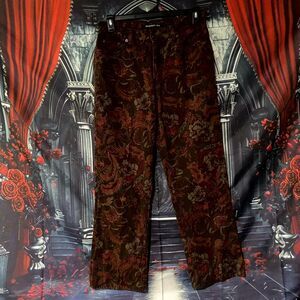 The pants feature a classic straight leg silhouette, offering a comfortable, flattering fit that remains timeless. The fabric is likely a thick, durable denim or perhaps a fine corduroy blend, making them a cozy and substantial choice for cooler weather or as creative outerwear. Their ornate pattern allows them to transition from a sophisticated, elevated look to a