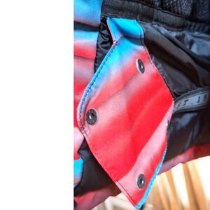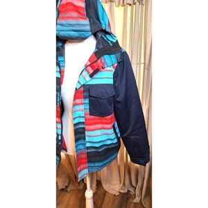 Dark blue with lighter blue and red striped design. 1 front breast pocket, 2 side pockets and 1 inside mesh pocket. Hooded with a bill.