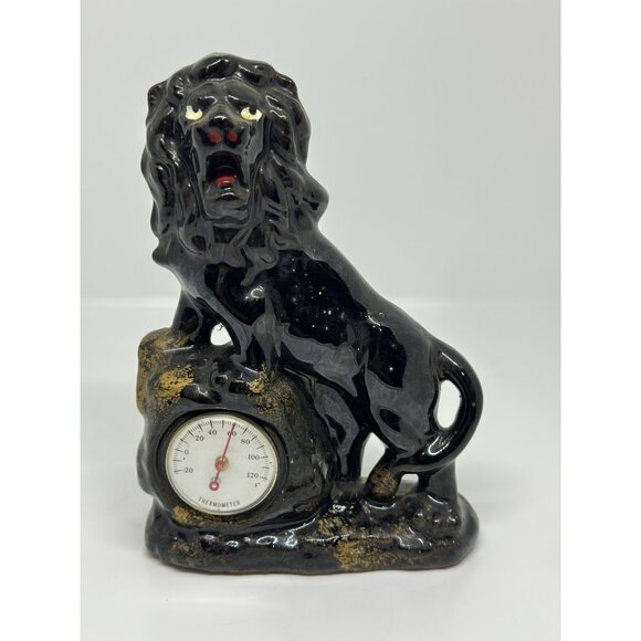 This vintage ceramic lion figurine, crafted in Japan, doubles as a practical thermometer. The black glaze and gold accents evoke a regal charm.