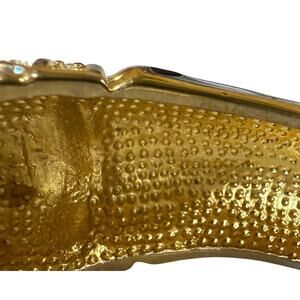 This marvelous vintage hinged cuff bracelet features a dimensional-looking glossy black enamel Panther. Very Ciner in style! His face, ears, and neck are outlined in gold plate, and two brilliantly green marquis rhinestones form his glittering eyes. Fabulous! The bracelet closes with a tongue-in box clasp, and the back half of the bracelet is gold tone. This bracelet is meant for the smaller wrist; its interior measurements are 2 1/4 inches side to side and 2 inches front to back. I think it will comfortably fit a wrist of up to 6 1/2 inches in circumference. Quite sculptural, the head of the Panther measures three-quarters of an inch in height. Condition is excellent – no chips to the enamel and the hinge and clasp both work well. You'll be admired with this attention-generating bracelet. Enjoy!