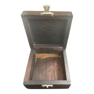 This vintage jewelry box is a beautiful piece for any collector or lover of Americana style decor. Crafted from black rosewood, this rectangular box features a stunning elephant inlay in a jungle desert scene. The fitted lid ensures your jewelry stays secure inside. Made from wood, this original piece is perfect for those who appreciate the natural beauty of materials. The dark wood adds a touch of elegance to any room. Add this unique item to your collection today. Great condition. A couple spots on the lid. See photos. The rest of the box is in excellent condition. 4”x4”x 1.5” D