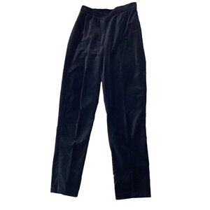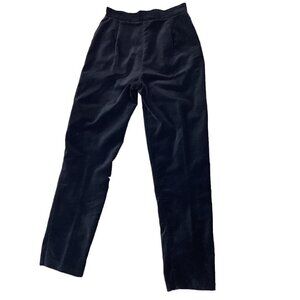 Elevate your wardrobe with these vintage black velvet trousers by Panther in a junior size 9. The high-rise dress pants feature a pleated front and straight leg style, perfect for any special occasion. The pants are made of 80% wool and 20% nylon fabric, ensuring a lightweight and breathable fit. The pants have a classic solid pattern and are accentuated with buttons and a zipper closure. The versatile pants can be dressed up or down and are suitable for weddings, parties, business meetings, or holiday events. Dry clean only for optimal care.