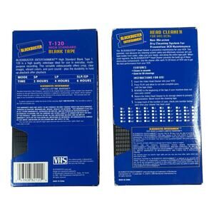 This lot of two vintage Blockbuster VHS tapes is in GREAT previously used condition. The front, back, sides, and corners of each of the two cardboard VHS sleeves have wear from age and previous use (see photos). Each of the two VHS tapes has cosmetic wear in the form of minor scuffs and marks from age and previous use (see photos). The Blockbuster T-120 High Standard Blank Tape comes with its original unused blank VHS label stickers. The Blockbuster Dry System VHS Head Cleaner has been used six times and is listed on the back of the VHS. The cleaner can be run 50 times as listed on the back. The quality of the blank tape and dry head cleaner is unknown.