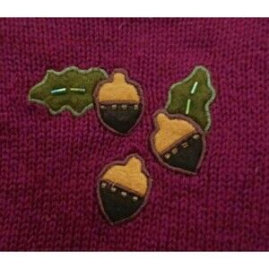 The VTG Bobbie Brooks Burgundy Cotton Blend Fall Autumn Theme Knit Vest in size L is a stylish and cozy addition to any woman's wardrobe. Featuring a sleeveless design with a v-neckline, this tight-knit sweater in a multicolor autumn pattern is perfect for casual occasions. The appliqued design accented with beading adds a touch of vintage charm to this regular fit vest, making it a unique choice for the fall season. Hand wash only to preserve the quality of this classic piece from the Bobbie Brooks brand. Pit to pit 21" length 24". Vest is pre owned, clean, no rips or stains, there are a couple of bugle beads missing on the applique.