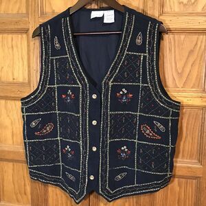 Vintage Bobbie Brooks Floral Corduroy Vest. Women's size XL, Navy Blue with Embroidery, Autumn & Fall Leaves, Flowers, Cinch Tie Back, 4 Button Top. Great for Teacher, Granny Core, Cottage Core, Farm Core, etc. So cute!