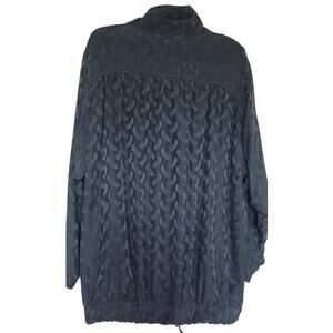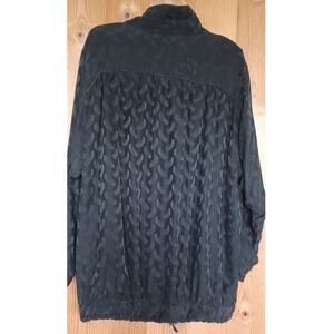 Vintage Bobbie Burns Black Silk Coat Women's Size 2X Embossed Design, Pleated Funnel Collar, Snap Front, Slash Pockets, Drawstring at the hem. Oversized 90s style.