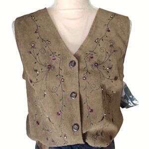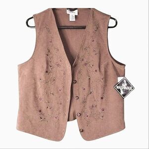 VTG Boho Brown Faux Suede Floral Embroidered Button Front Vest Medium
