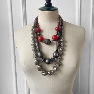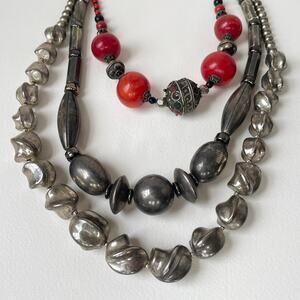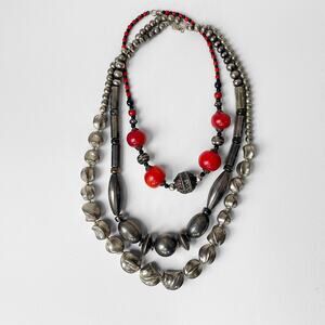 VTG Boho Layered Necklace Lot Silver-Tone Tribal Glass Resin Beads 80s 90s 3 PC