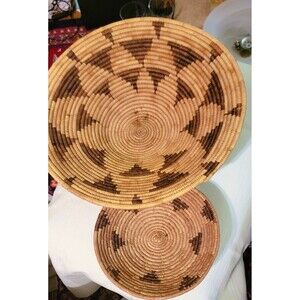 Vintage Set of two hand woven basket/ bowl/ decor items woven by hands in Botswana Africa by women. Beautifully hand woven coils with geometric shapes in the pattern known as "the Flight of the Swallows" in the natural fiber color & a brown die made from palm tree bark and roots. The larger basket has a yarn tied loop on back for hanging on the wall. The African basket is a cultural piece & adds an authentic aire to surroundings. The woven bowls look very nice sitting out on display, & they also look really cool up on the wall. Women of the Bayei and Hambukushu tribal groups painstakingly create this art from mokola palm tree fiber coil woven around grass or vine.
