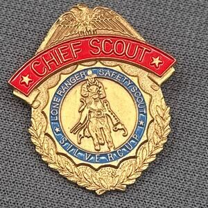 scouting memorabilia, chief scout badge, lone ranger safety scout, fleur de lis eagle pin, scouting history, camping gear collectible, retro Americana, patriotic insignia, 1940s scout pin, BSA cub scouts wolf, scout leader pin, outdoors heritage, survivalist collectible, historical youth group