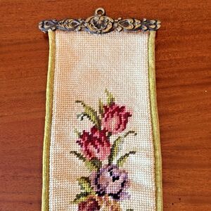 This vintage brass bell pull is a stunning decorative piece featuring hand-stitched petit point embroidery in a beautiful rose floral design. Measuring 33.5 inches long, it adds a touch of timeless elegance and Cottagecore charm to any space.