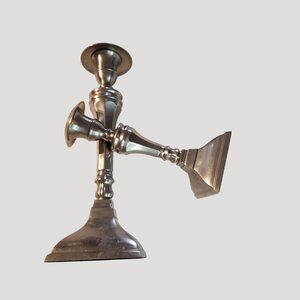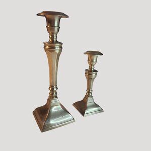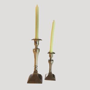 A refined vintage charm graces this pair of brass candlestick holders. Their square bases and tapered design reflect understated elegance, perfect for curated spaces.