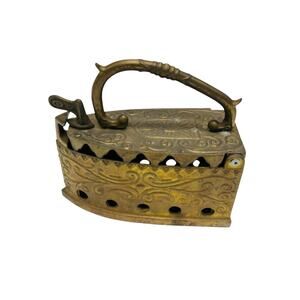 Vintage reproduction brass sad iron with ornate embossed scrollwork and vent holes. This piece mimics the style of early coal-heated irons but was likely made for decorative use. Features a hinged lid, stylized handle, and working latch. The solid brass has a warm patina with some age-related darkening, enhancing its rustic charm. Ideal as a doorstop, bookshelf accent, or cottagecore farmhouse decor. Lid opens and closes properly. No cracks or structural damage. Light surface wear consistent with age. A charming collectible piece with old-world appeal. Please see all photos for details and condition.