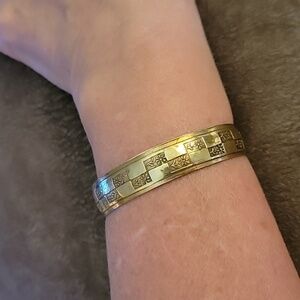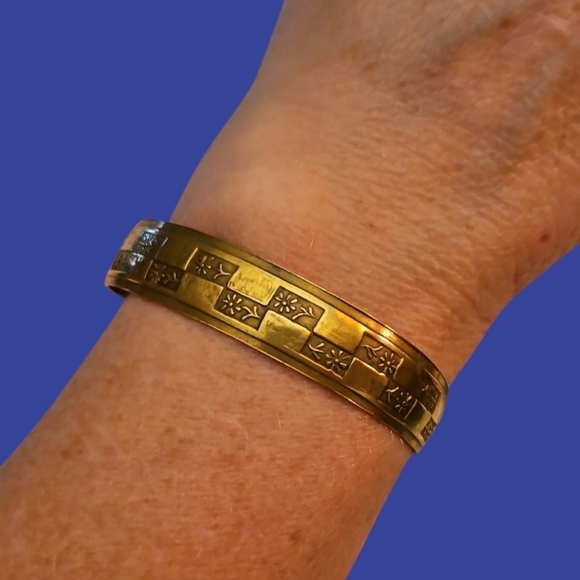 VTG Brass Floral Checkered Engraved Cuff Bangle Boho Bracelet