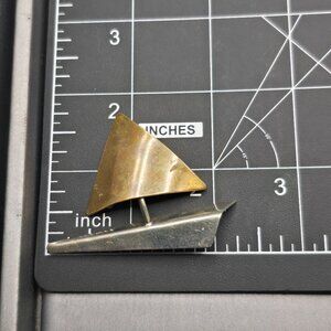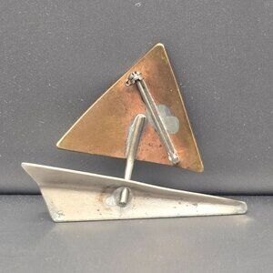 Vintage modernist abstract brooch crafted in brass and stainless steel. Features a unique geometric triangular design with angular lines. Measures approx. 2.25" wide. Signed “00” on the silver portion. Secure pin-back closure. Excellent pre-owned condition with natural patina and light surface wear. A striking collectible accessory for lovers of modernist jewelry design.