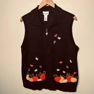 VTG Breckenridge Petite Sweater Vest Black Zip Orange Pumpkin Fall Leaves PXL