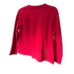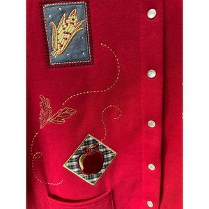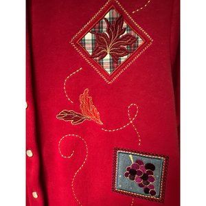The Breckenridge women's Petite Medium red fleece-lined cardigan is adorned with pearl snaps. Detailed with an appliqué, this piece adds warmth and style to any outfit. Comes from a smoke free home.