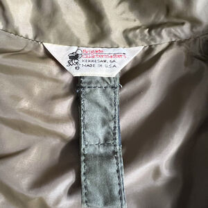 Used vintage condition. Signs of age and regular use present including wear on the snap buttons, a few hanging threads, some spots of blemishing/staining, a spot on the back that has frayed, and the elastic around the hood is no longer springy. Please see photos for more details on condition.
