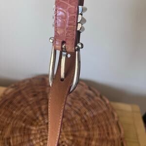 VTG Brighton Skinny Pink Belt Sz 36 XL Croc Leather Silver Embossed Floral 90’s