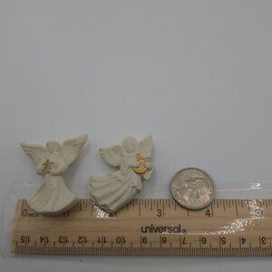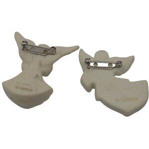This is a set of vintage Lenox white porcelain angel brooches, one holding a gold lyre harp and the other a gold star