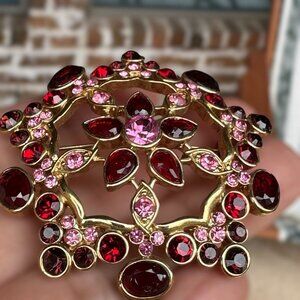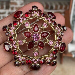 VTG Brooch Pin 2" Rhinestone Blooming Flower Pink Red Gold Plated Geometric