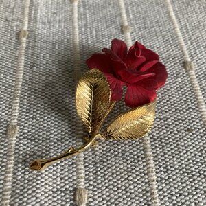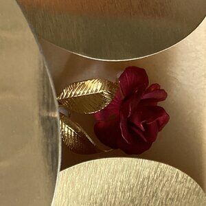 Vintage dimensional flower Brooch Pin Cerrito Red Rose Flower Gold Tone Jewelry In Original Paper Box (box has surface wear)