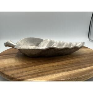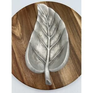 Beautifully cast metal dish in the form of a single leaf with veined details and a curved raised edge. Silver-gray pewter finish with an organic, naturalistic shape. Sturdy, heavy construction, ideal as a catchall, trinket tray, or decorative accent.
