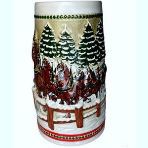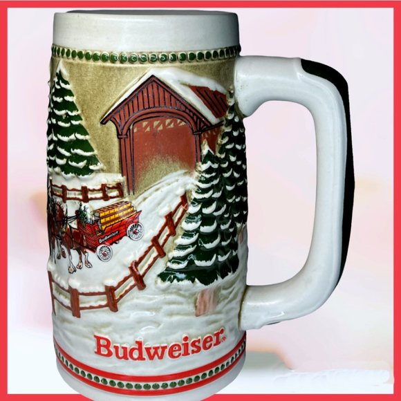 Vintage Budweiser Stein 1984 by: Ceramarte Brazil, Collectable Stein Handcrafted Expressly For Anheuser Busch Inc. Pre-Owned LIKE NEW - No cracks, chips, discoloration, stains defects or nicks. 👀( Please see pictures as to the condition of the Stein )👀 The majesty of the world famous Budweiser Clydesdales has become a Holiday tradition. This Limited Addition Stein depicts the Hitch Passing through a covered bridge on a snowy winter's eve. Add to your collection or as a gift to the avid Budweiser collector. Thank you for looking, Have a Groovy Day & Enjoy!