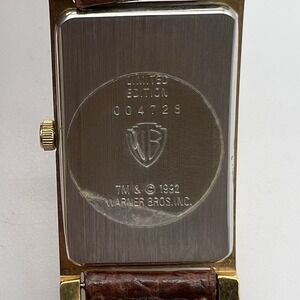 This 1992 released vintage style numbered limited edition Bugs Bunny watch by Pedre was exclusively commissioned by Warner Bros as a tritbute to the 1940 original depiction of Bugs by the Warner Bros animators. This is a new, sold out working wristwatch originally designed as a mens watch size but now a collectors prize. The case is 18K gold electroplate. Three hand quartz movement dial with analog display. Rectangular Case diameter 36mm x 24mm., mineral crystal, Textured brown 18mm leather band. Fits up to a 8 1/2 inch wrist. This watch comes in a Warner Bros. padded case. Each watch case back has a unique limited edition number. This is a sold out vintage collectible limited release item. The hinges on the padded case are not working properly so the case does not open and close smoothly