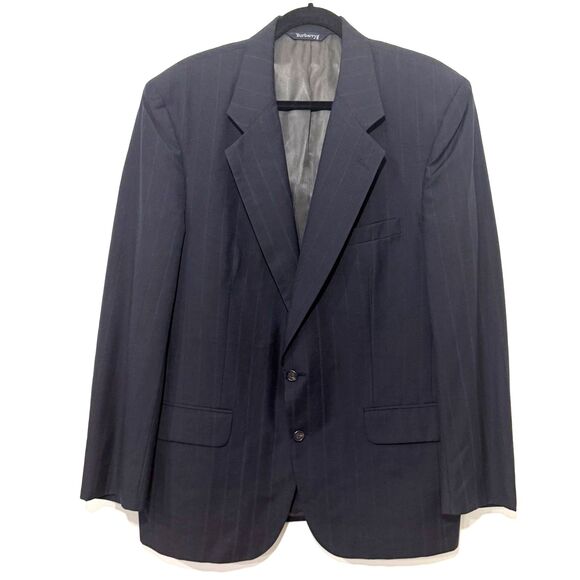 VTG Burberry's 100% Pure Italian Wool Pinstripe Blazer - Black/Blue. This item is pre-owned in good condition. Some light bubbling at the chest. See last two pics.