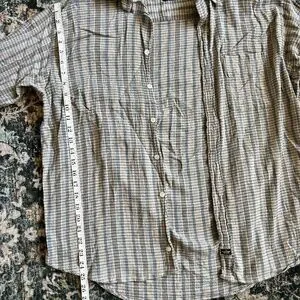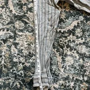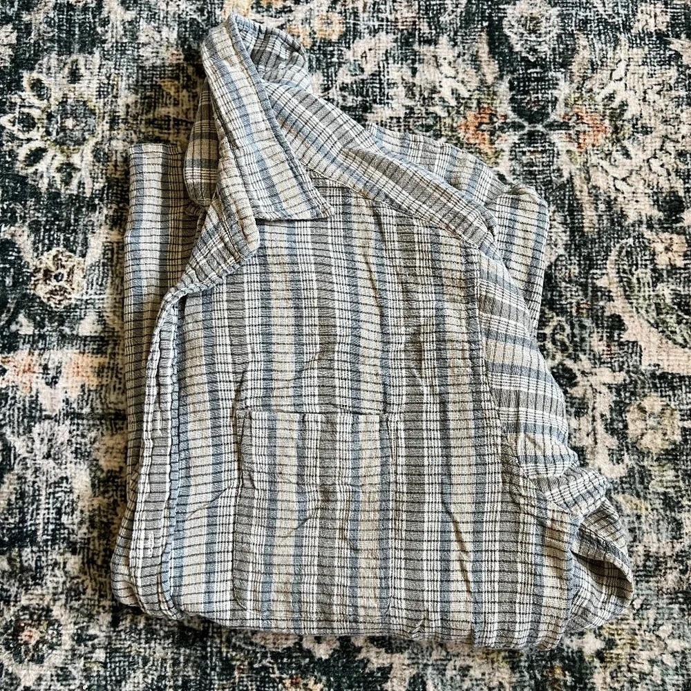 Vintage Dockers striped button-up shirt, linen look, would make a great beach cover up. Size Large, 100% cotton, shoulder to hem 25" (though hem comes down a little more in the middle - see pics), shoulder to sleeve 22"
