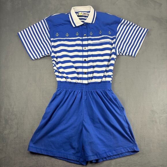 VTG CA Sports Romper Women's Medium Blue/White Striped Nautical Stranger Things